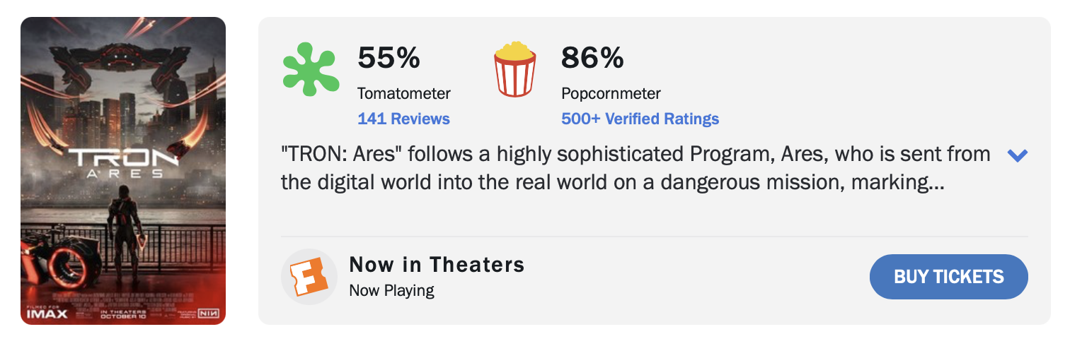 Many enjoy movies that didn’t set records at the box office or have critics raving about them. But, without good reviews from critics and audiences alike to help sell tickets, big sequels to big movies don’t get made right away. It took fifteen years for “Tron: Ares” to make it to the screen. If this one fails, expect another long wait for the next one if it comes at all.