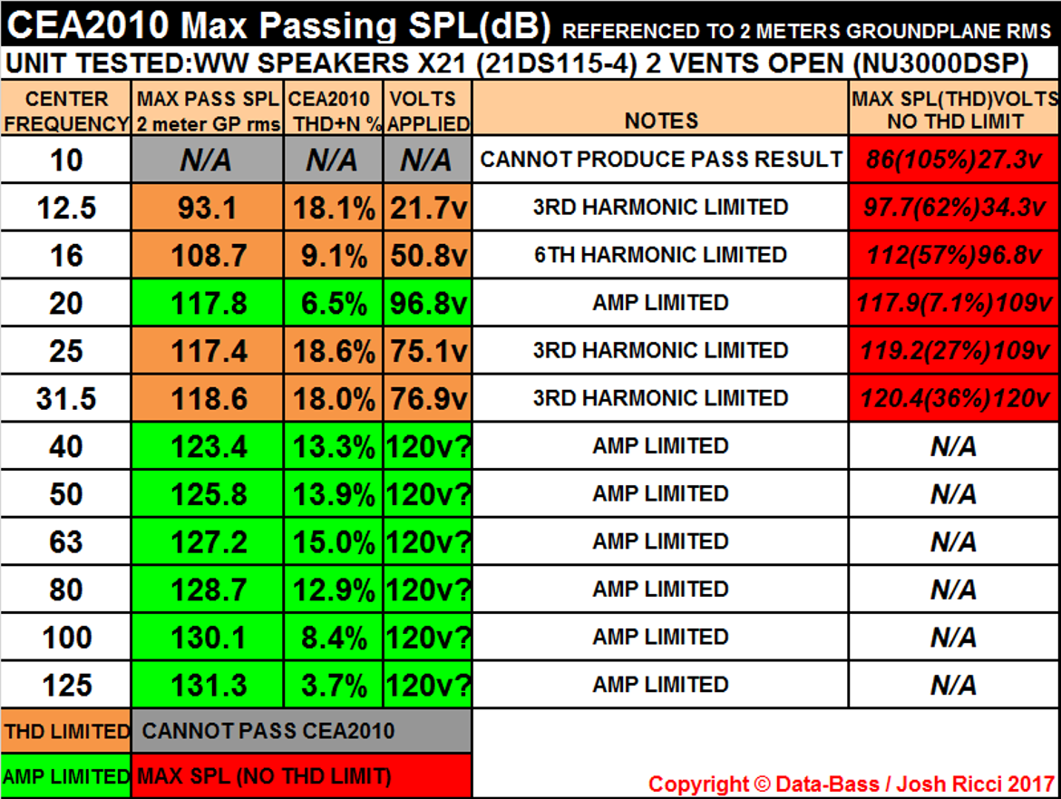take this driver, one that is very popular amongst DIYer right now. This insane pro audio subwoofer driver is very sensitive, has huge amounts of xmax for such a driver, and can absorb 5000 watts program power. In fact, for dynamic peaks, its more like 7000+. That means that if I am to test this subwoofer such that the conclusion is that my numbers of the maximum output of the subwoofer and not my amp, I need an amp capable of more than the sub can handle, and that amount more should be a certain number of dB's headroom. Let's call it 3dB. If I think I need 5000 watts to test this sub, then I need a 10,000 watt amp for this. They exist, but are very expensive. It also means I need a 240 volt 30 amp line. This is what Josh Ricci does, but it's not something James or I have access to, nor are we too interested in doing this.