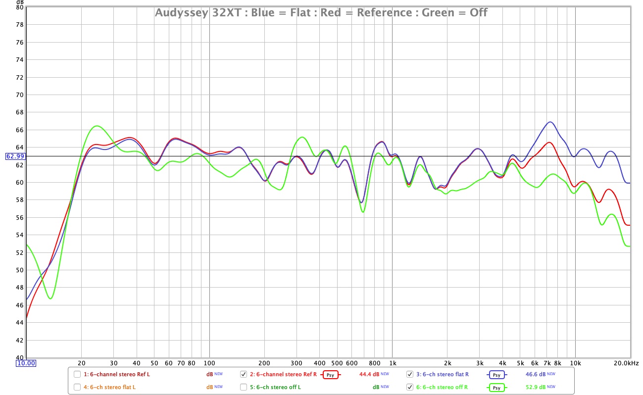Flat also has a nasty little upward kick in the curve for some reason that does not exist in the OFF (natural rolloff in room) curve. It's slightly up in reference and both are well above OFF. Reference is a bit more sibilant sounding with some recordings than OFF, but FLAT is awful sounding with high frequency nasties and high sibilance with many recordings.