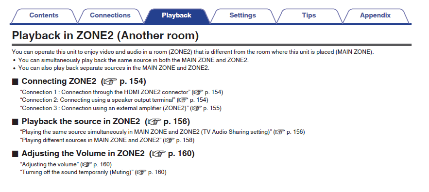 However, if “Source” is selected for Zone 2 while CBL/SAT is selected in the Main Zone, audio from CBL/SAT will be output in Zone 2 without needing the PCM 2.0 setting. This is a feature common among different brand AVRs. So, selecting Blu-ray in the Main Zone and CBL/SAT in Zone 2 using only HDMI connections means the CBL/SAT signal will need to be set to PCM 2.0 for output to Zone 2. That setting can be made at the source and also in the receiver itself in the Zone 2 Setup.