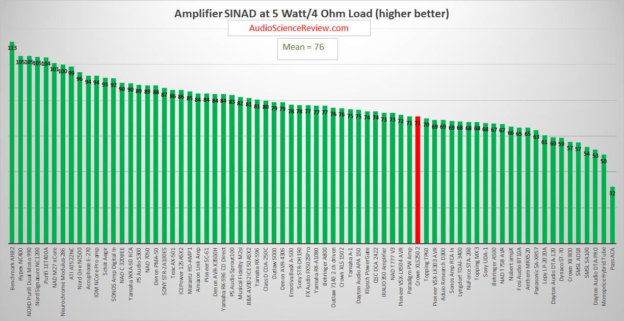 I used the XLS1502 on a subwoofer. Noise was an issue for me. In regards to the above SINAD chart for amps.. check out the Denon Amps. Better noise/distortion than many separate amps. SINAD of 85+ is pretty darn good...