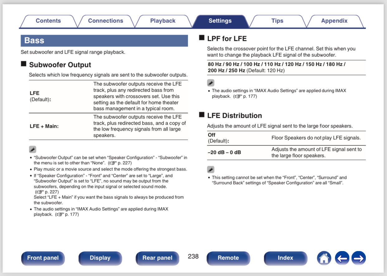 Annoying still for many is the need to apply LFE+Main, Double Bass or Extra Bass settings to Subwoofer output when Main/Front speakers are set at Full Band/Large in many AVP/AVRs because LFE is cut off from Subwoofer pre out when they are not applied. The manuals say LFE “may” not be output to the subwoofer when those settings are not applied. I think it safe to say it is NEVER output from the subwoofer in that case.