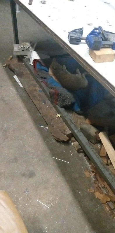 This is Frito, a recent feral at work. He was skin and bones, pathetic, really. He didn't want to know anyone. His brother (who was actually loveable) died, and then he decides we should be friends. He's a lord helmet. Will rub up on you to be petted and then bite you. But then he's sweet too, sometimes. At night I sit down for 20 mins before I leave. He automatically goes to his bed under my table when the lights start getting shut down. This is our ritual. He is one of about 50 that have been born around this shop. The cars get what the hawks miss, usually. Every day when I walk in, he's working me over to be fed. Pretty much my shadow, otherwise.