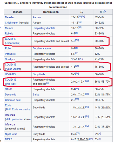 The original corona virus strain (wild type in the table) has an R zero estimated at 2.9 – enough to require that 65% of the population be immunized to achieve herd immunity. Delta, with an R zero in the range of 5-9.5, now requires immunizing 80-89% of the population before we can hope for herd immunity. Here is the link: