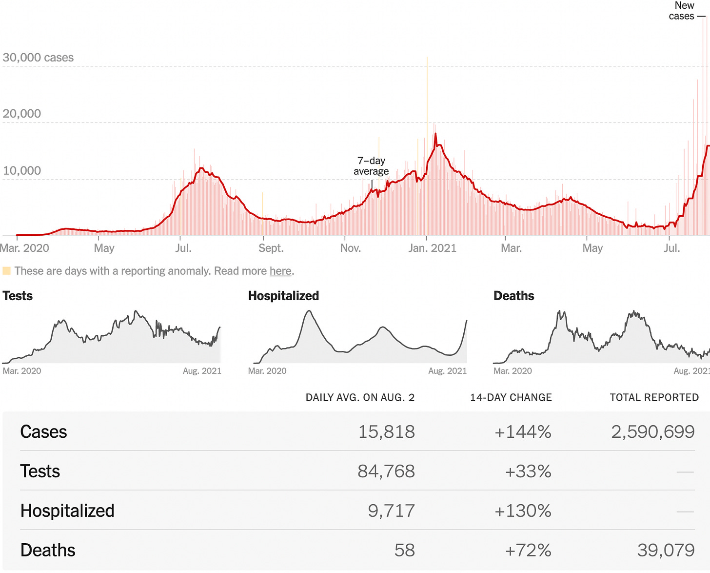 Case counts in Florida are at the highest level ever—worse than the darkest period of last winter. And this is with testing at a lower level than last winter. Hospitalizations are headed way up. The deaths will follow in a couple weeks. Here’s how it currently looks:
