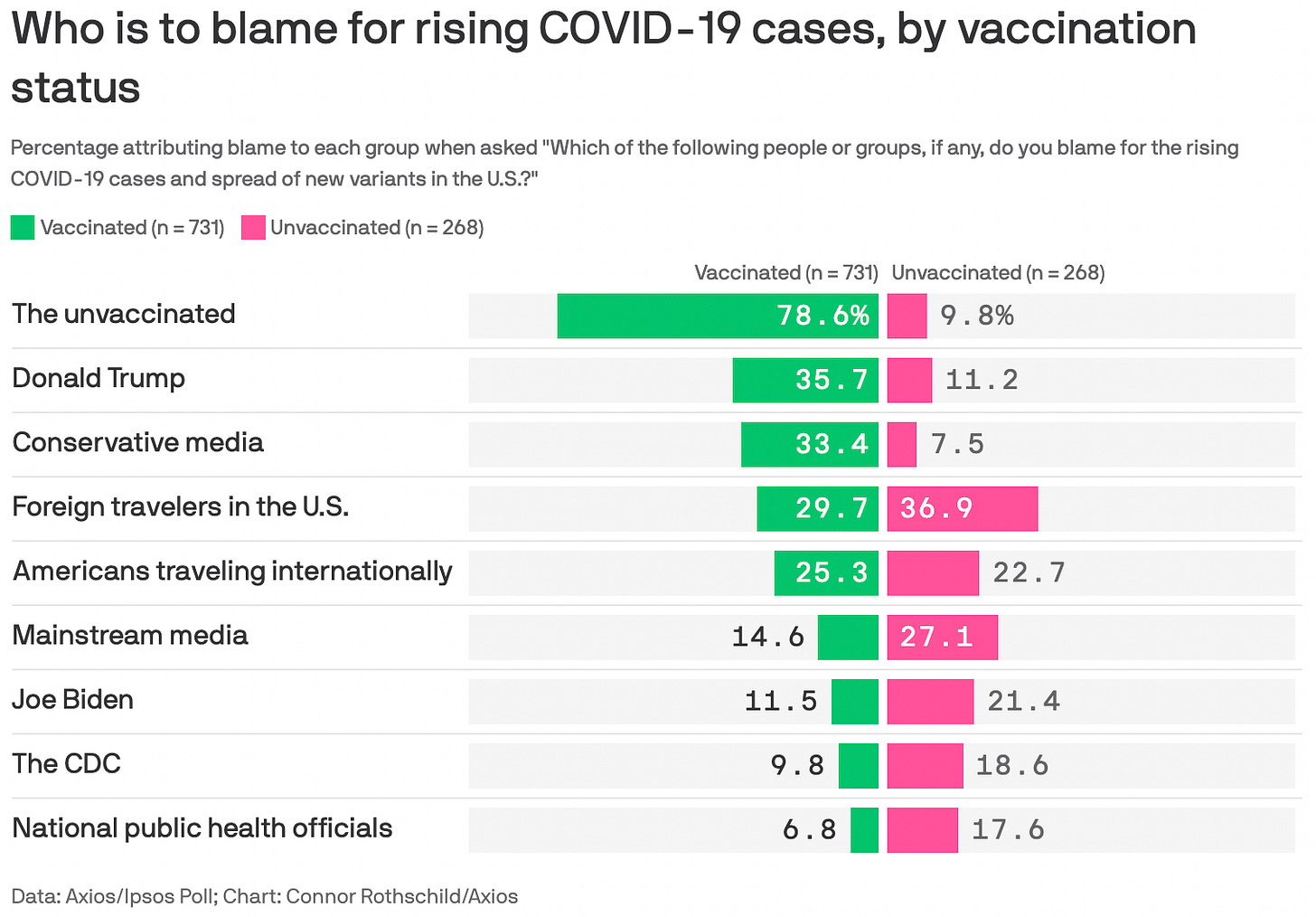 Axios released a poll this morning that I’m still trying to fully digest. They went into the field and asked both vaccinated and unvaccinated people who they blame for the current surge in COVID cases.