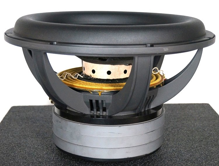 "The cast aluminum basket for the driver is very large; it measures 15” from frame edge to frame edge, and most other subwoofer manufacturers would simply call this a 15” driver, but the moving surface area is that of a 13”. The driver uses the basket of a 15” so that there is room for the spider and surround which the wide diameter of the basket supplies. This larger space is needed because it is more difficult to have the right suspension compliance for high excursions in smaller baskets since smaller suspension areas normally entail tighter compliance and therefore shorter throws. This is doubly true for this driver because the large diameter of the voice coil former takes up so much space. The surround is also quite sizable with a 1” height and 1 ¾” width; that should enable the moving assembly a very long throw before high tension restricts motion. The underside of the surround has a radial grooved structure that could possibly assist in keeping surround deformation more uniform at high excursions, thus reducing distortion."