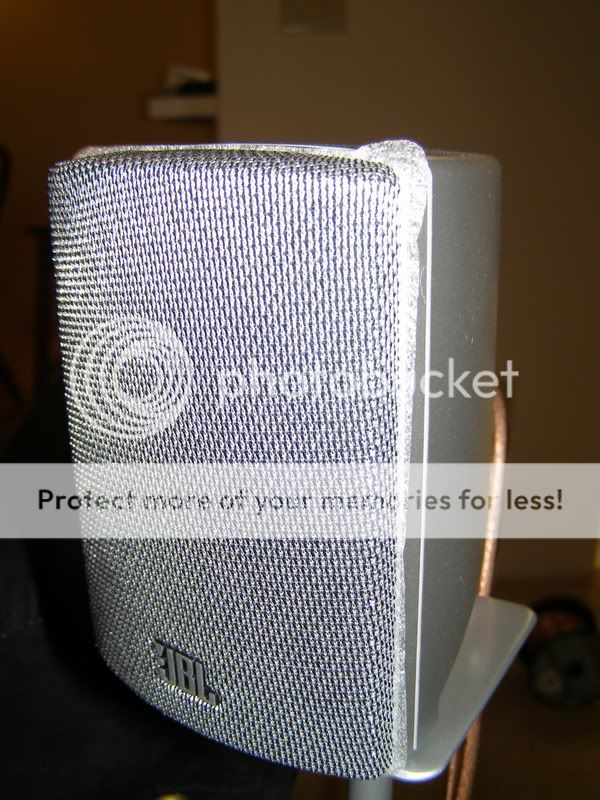 Unfortunately, I'm worried that something might be wrong with my little JBL satellite speakers. When the guy in Best Buy turned them up in the store to let me listen, they sounded crisp and clear. When I pulled them out of the box, though, I noticed something kinda funny. Around the edges of the front and rear speakers, there was something like a white piece of cloth poking out from behind the covering. The center speaker doesn't look like this, and neither did any of the speakers on display (as far as I noticed, anyway).
