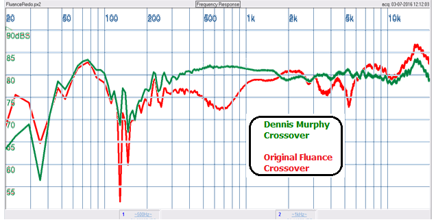 I spent the weekend seeing whether the Fluance drivers lent themselves to an all-out redesign of the crossover network. As it turns out, the drivers are beautifully behaved over a usable portion of their frequency response. It did take quite a few components (18, including 4 inexpensive resistors and one high-quality capacitor that could be harvested from the existing board), but the result was a very smooth response with excellent phase integration and a benign impedance curve that varies smoothly between 4 and 8 ohms. I've attached the on-axis plot. The off-axis response is also very smooth on out to 45 degrees. The design is optimized for a listening distance of 10 - 12 feet. At that distance, the simulations show that the slightly elevated portion between 300 Hz and 1200 Hz flattens out. I've also attached that simulation. As I explained in my previous post, you can ignore the portion below 200 Hz both plots, where room effects come into play. If you compare the plots with the previous ones, you can see that the average sensitivity hasn't changed. These measurements weren't scaled for the standard sensitivity spec, but I would estimate that it's around 88 dB, which is excellent. I think the sound is first class, with excellent bass power handling. The woofers don't go much below 40 Hz, which is the trade-off for high sensitivity, but it's certainly good enough to rock out and alienate the neighbors.