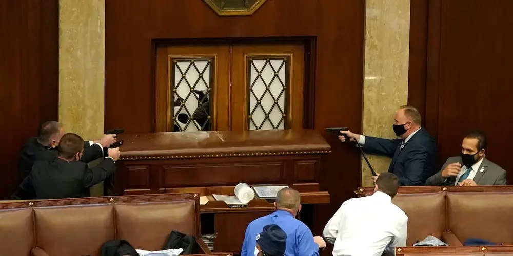 A picture of the Capitol Police in the Congressional chambers. And a woman has been shot.