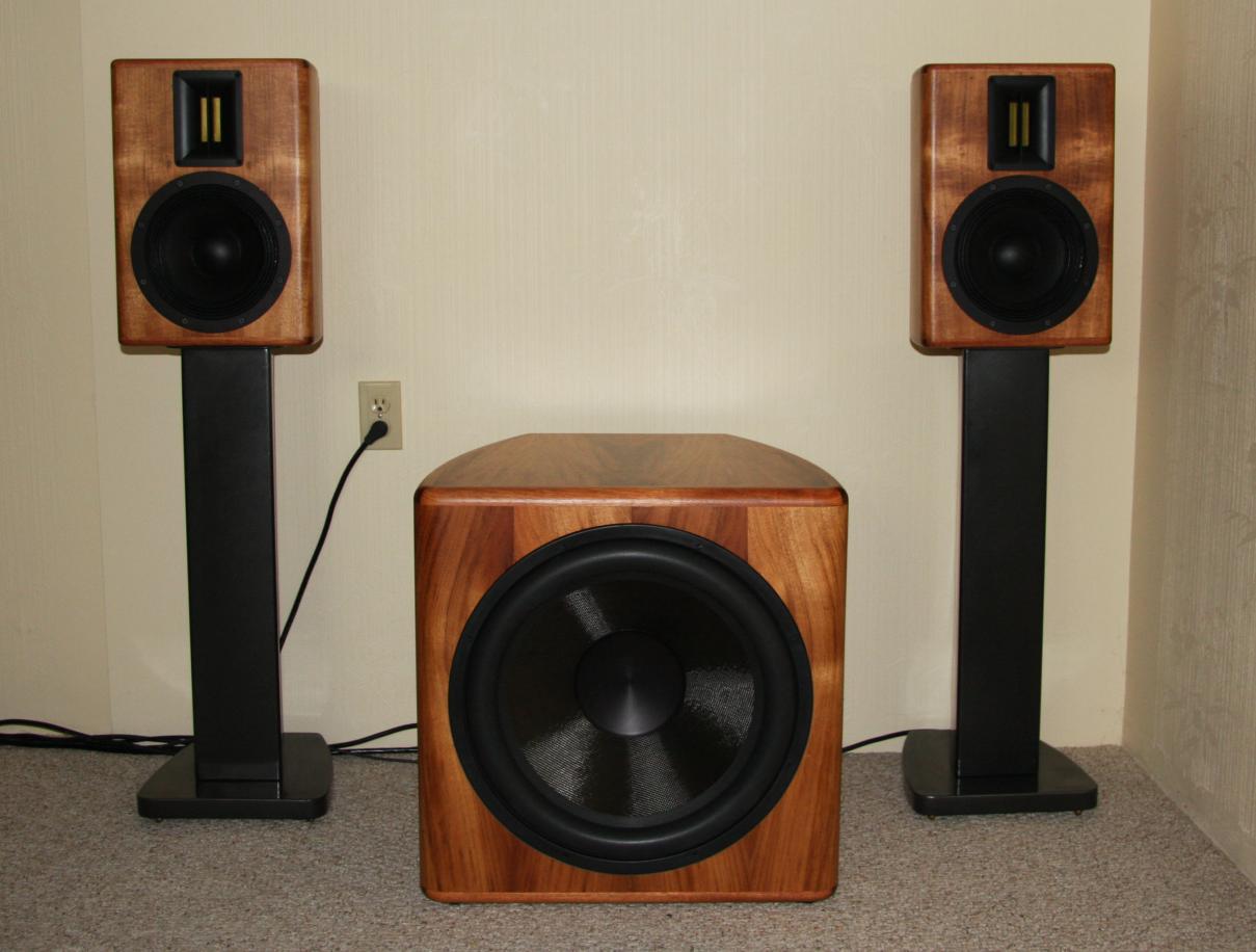 Finished in Koa. the pic doesn't do them justice, because Koa has a golden iridescence that makes me smile every time i see my speakers.