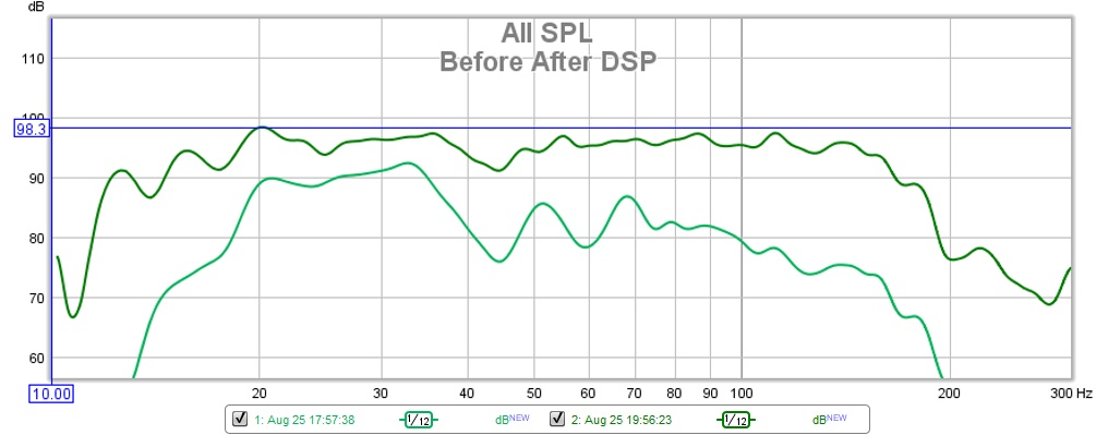 Both measurements were taken with Audyssey turned off, pure direct, crossover at 250hz, subs only. Dark green is after applying the filters to the mini. I see an improvement!