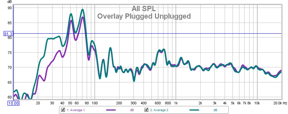This is with my sub, crossover 80hz, one port plugged, EQ1 (deep extension mode) and no bump to the sub channel