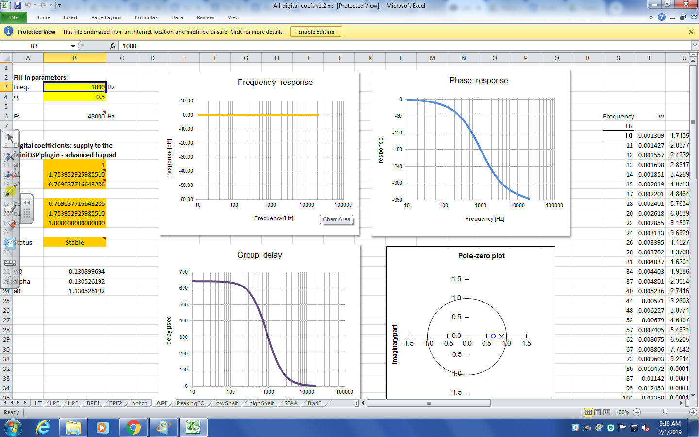I just see one spreadsheet named "biquad calculation spreadsheet" I downloaded it and what I see in the file versus what is on the webpage VIA screen shot is a little different. This is what I see in the downloaded spreadsheet below. In the file, there are 3 fill in parameters: Freq Q Fs.....