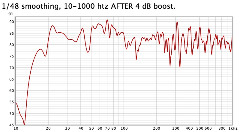 Did you read my most recent post? The 12 dB deficit in bass disappears when when running 2 rather than 4 subwoofers.