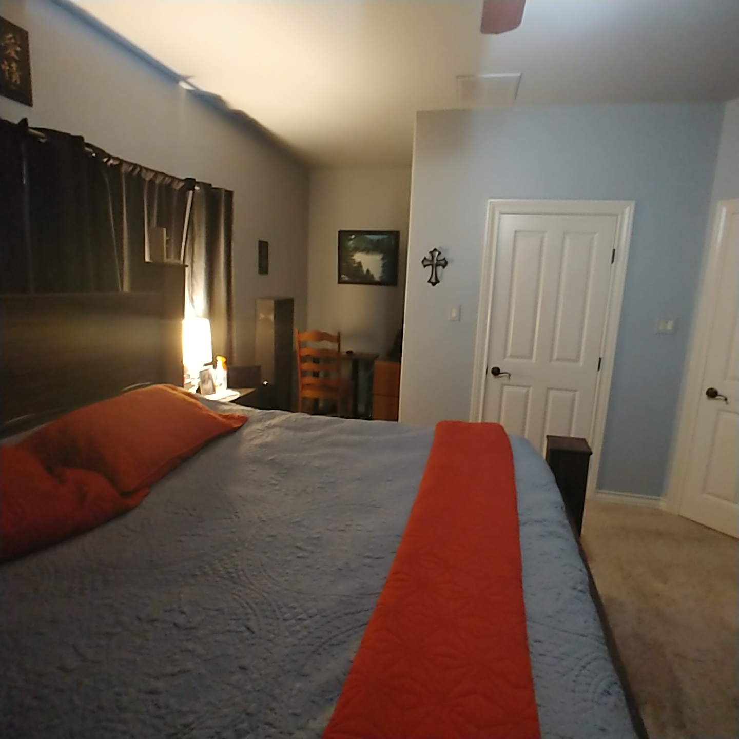 That is close to my bedroom setup only its a smaller room. You got room use it or tidy up to make it to your liking! You can also get a full size bed and sell the King. :)