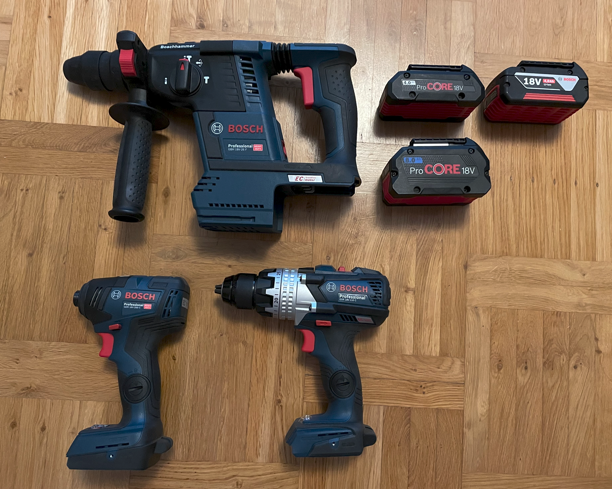 The rotary hammer drill at top have a drill-only mode but it's not what I'm reaching for when drilling a small hole. The drill/driver at bottom right is mostly used for drilling while the impact driver on bottom left is what I reach for when screws and nuts are involved.