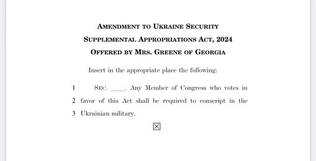 Rep. Marjorie Taylor Greene introduced an amendment requiring members to “conscript in the Ukrainian military” if they vote for the Ukraine supplemental bill.