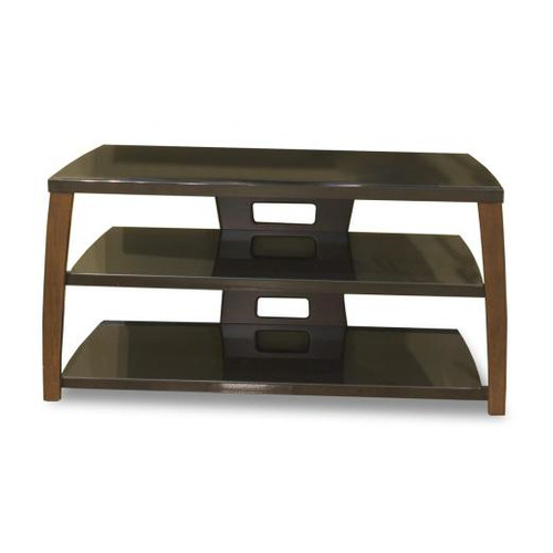 I thought it was wood shelves. Listed construction as wood. Turns out the shelves are glass on steel frames while the legs and back are solid wood at least. Still, it's sturdy as all get out and the top shelf is rated at 175# and fits the TV nicely.