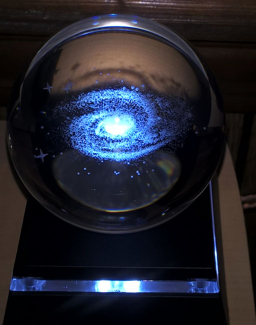 Oh my...yet another Raiders of the Lost Ark Staff of Ra headpiece medallion has arrived (the one from the bar scene in Nepal and map room in Egypt, which is different from the one shown when the old guy is reading the writing on it). I also got this SLICK laser etched sphere with a galaxy inside. Looks pretty spiffy on the light box I was using with my Blade Runner 2049 etched orb.