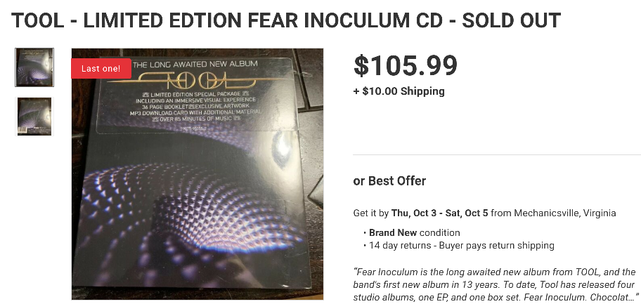 At least you have digital now, right? It's a banner year for Tool fans. Just found a sold out eBay ad for over 100 bucks. I had no clue. If I could have predicted that I for real woulda bought 20 copies and flooded 'em all over eBay. I'm a huge fan but that's a little nuts.