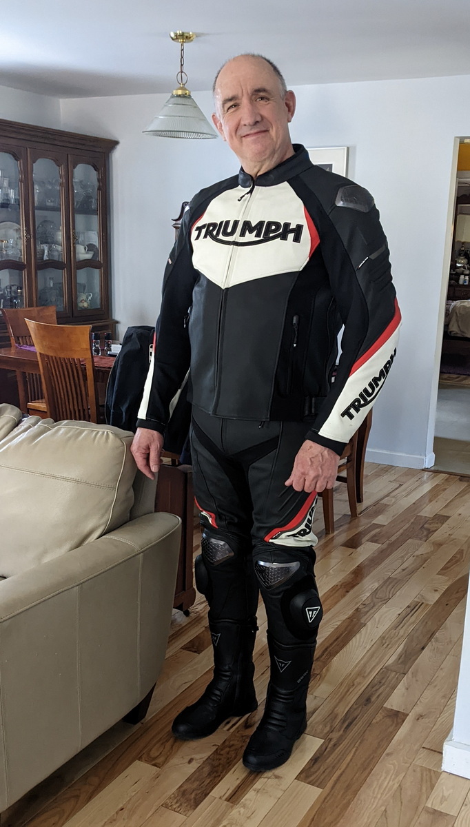 Tight, but they fit. If I can lose a few pounds/kilos they'll be a little easier to get on. They have a full circumference zipper to mate the jacket and pants, meeting the track day requirement. A little gaudy, but maybe the distracted cage drivers with notice me. I have plenty of other road-riding gear too, for various conditions of heat, rain, or cold.