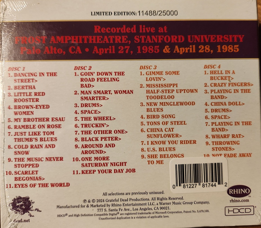 These bring to 171 concerts on the computer. I used to have a lot more when they were all on cassette from tape trading. Over 1000 cassettes, 500+ shows in total but the CD's that the Grateful Dead Org are releasing are way better quality than several generation copies of cassettes.