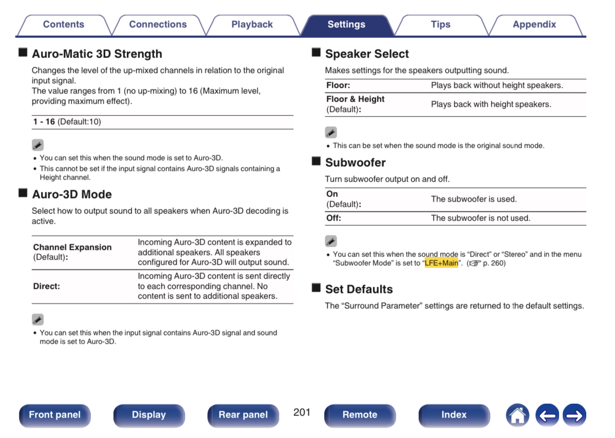 But I think the secret might be the Subwoofer Setting LFE + Main, which I think is a “Double Bass” feature.